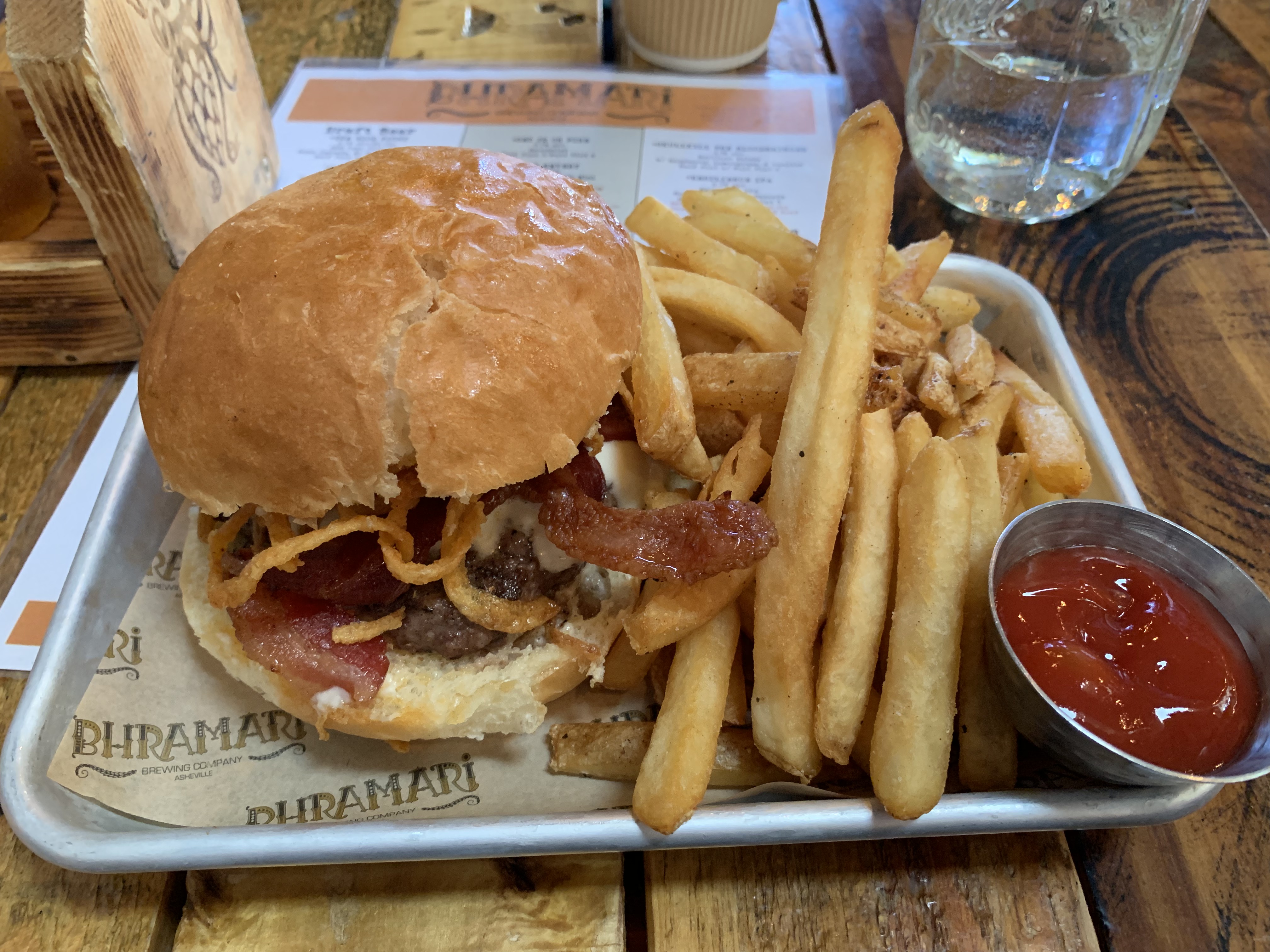 It was a beautiful day, and the atmosphere at the restaurant made for a relaxing meal with friends. They had an open concept eating room that flooded out onto the porch, where people were playing games and enjoying their local beer. I ordered the Bhramari Burger, a spent grain fed beef burger, with stout wort glaze, hop smoked American truffle cheese, crispy onions, oaked mayo, candied bacon, and pickles on a Geraldine’s bun. It was awesome.