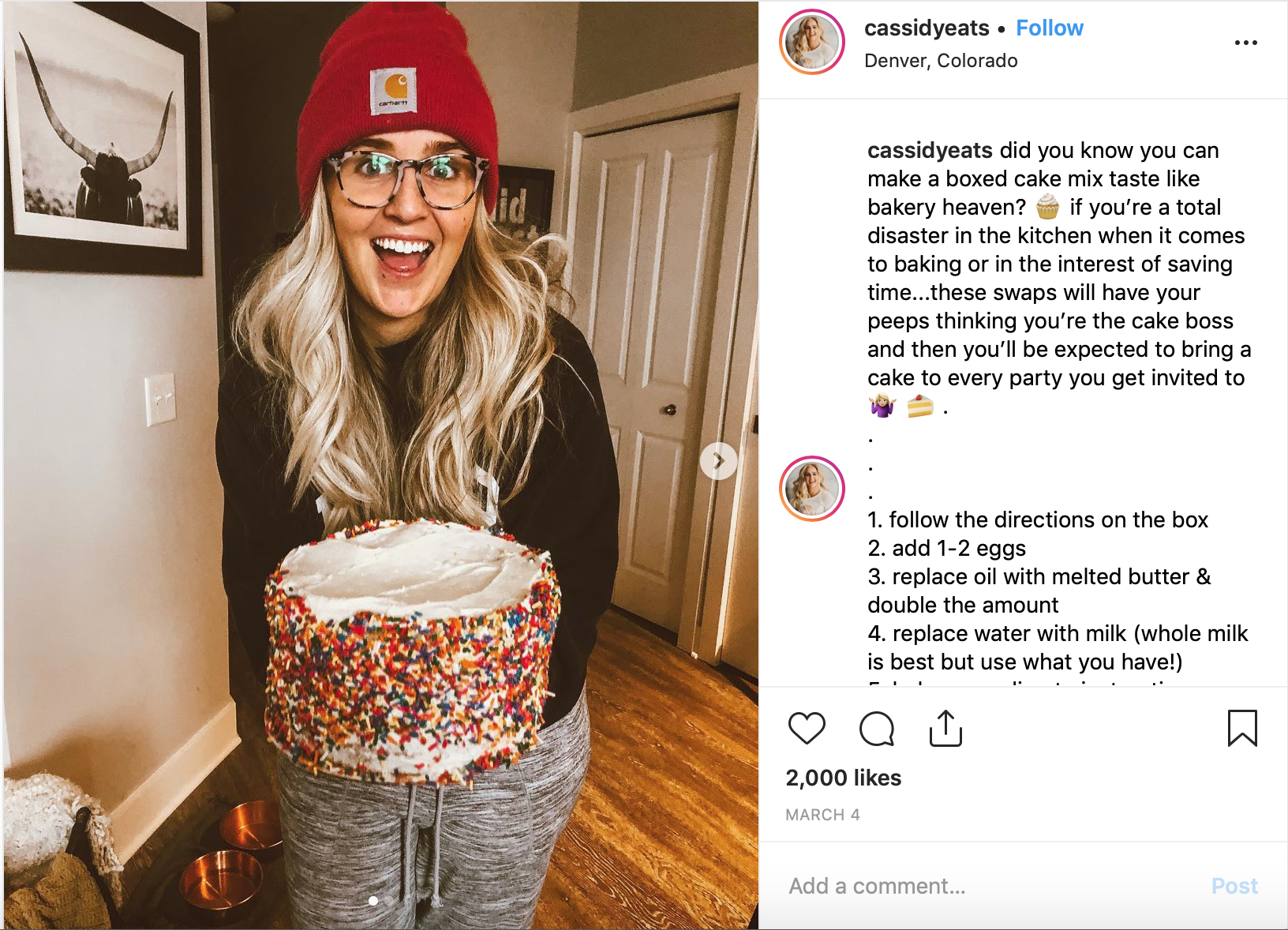 For birthdays in my house, we usually make cake for each other. Being college students, no one has time to make a cake from sratch, so people have been making cake from a box. More recently, I was tasked with making the classic Pillsbury Funfetti cake from a box. I wanted it to taste good, so I quickly google “how to make box cake mix taste better”. There were so many tips and tricks and simple switches to make your cake have a deeper flavor and texture. I cam across an Insagram account called @cassidyeats, where she had a post about “How boxed cake mix doesnt have to taste bad”. I followed her instructions on swapping oil for butter, and it mades the world of a difference. I got so many compliments from people saying that this cake was some of the best cake they have ever had, but little did they know it was a simple trick that I learned on Instagram that gave me all the success!